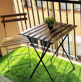 El soleado salón cuenta con cómodos sofás, smart tv, aire acondicionado y zona de comedor o reunión. Tiene acceso a un balcón con césped artificial, guirnalda de iluminación ambiental y mobiliario acorde.